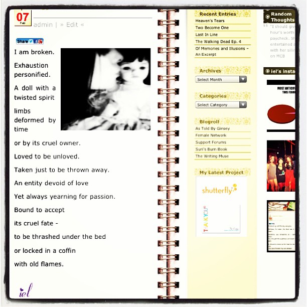 Ragged Doll February 18, 2014 ***Originally posted sometime in 2008 after revising it for my CW Class in Glendale College… Share this: Click to share on X (Opens in new window) X Click to share on Facebook (Opens in new window) Facebook Click to share on Pinterest (Opens in new window) Pinterest Click to share on Pocket (Opens in new window) Pocket Like Loading... Related